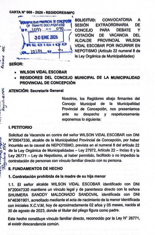 Ante estos hechos, los regidores Paolo Buendía, Anthonella Rubina, Karen Vásquez y Macha Segundo presentaron el pedido de vacancia, amparándose en la Ley Orgánica de Municipalidades y la Ley de Nepotismo, que prohíben contratar familiares hasta el cuarto grado de consanguinidad y segundo de afinidad.