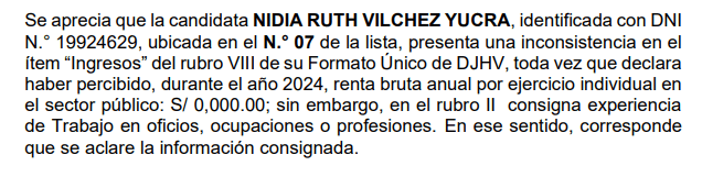 Según la Resolución N.° 00024-2026, emitida por el Jurado Electoral Especial de Lima Oeste, se detectó que Vílchez no consignó ningún ingreso económico en su Declaración Jurada de Hoja de Vida, pese a que actualmente se desempeña como docente en la Universidad Continental.