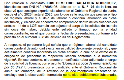 El consejero regional de Yauli, Luis Demetrio Basaldúa Rodríguez, intentó dar el salto al Congreso sin cumplir un requisito elemental: solicitar su licencia sin goce de haber dentro del plazo legal. Recién lo hizo este año, cuando debió hacerlo en 2025, y solo después de que el Jurado Nacional de Elecciones le jalara las orejas. El resultado fue previsible: su candidatura terminó al borde del abismo.